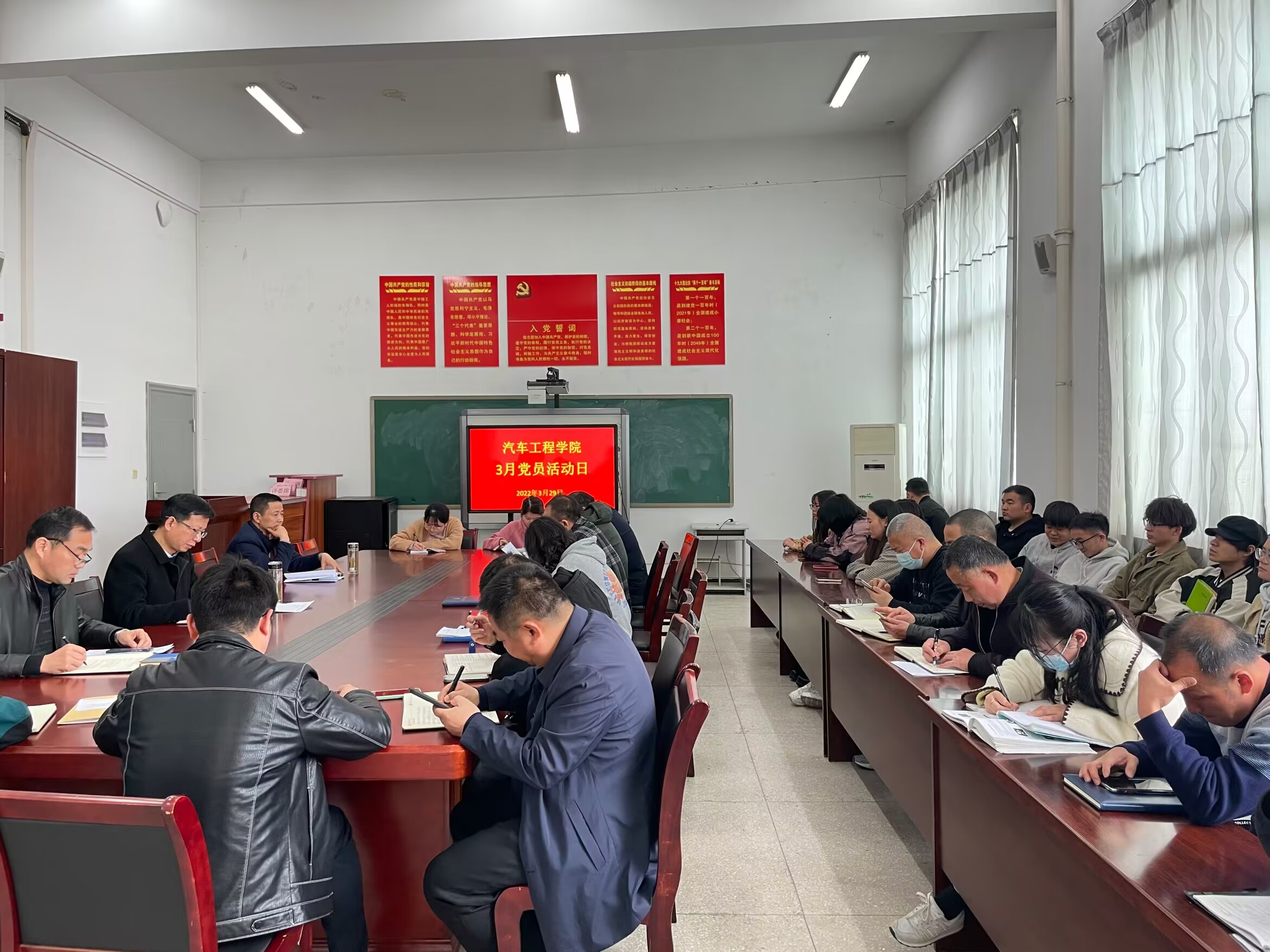 为深入学习贯彻落实党的二十大精神和全国“两会”精神,进一步增强基层党组织战斗力,坚定共产党员理想信念,稳步推进当前各项重点工作有序开展,3月29日下午,亚洲精品国产教师党支部与学生党支部在汽车楼四楼会议室开展三月份主题党日活动。会议由学校党委委员、办公室主任、学院党总支书记王海主持,支部全体党员参加会议。