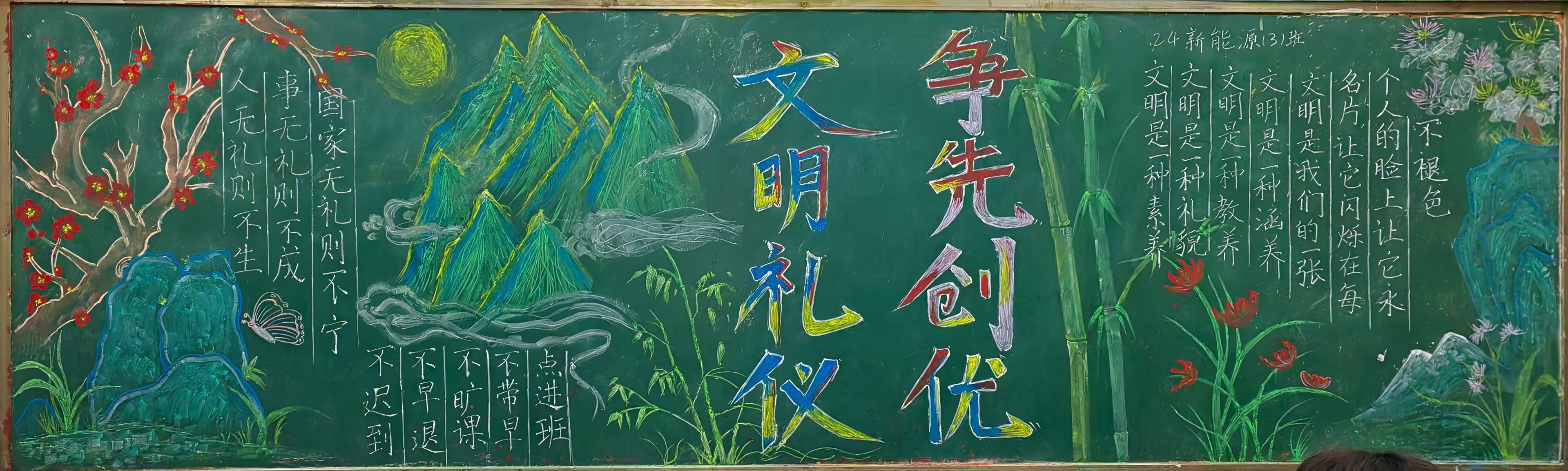 本次评比采用线上投票和线下评分相结合的方式进行,经过激烈的角逐,24新能源1班获得一等奖。其黑板报在众多作品中脱颖而出,无论是色彩搭配还是内容呈现,都展现出了极高的水准,充分体现了班级凝聚力和创造力。24智网1班和24新能源汽检1班 的板报获得二等奖。24新能源汽检3班、24智网2班、24新能源汽检2班的板报获得三等奖。