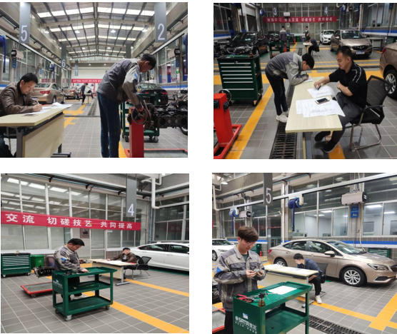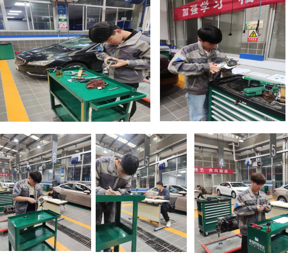 此次比赛同学们先抽签决定比赛顺序,共设置三个工位同时进行实操比赛,参赛的同学精神饱满、各显身手。比赛过程中,无论是曲柄连杆机构的拆装,还是气缸活塞环的拆装,无论是安装时一丝不苟的精准入位,还是查找维修操作手册,正确使用工具测量活塞环数据,快速判断测量结果,都充分展示了良好的业务技能和高素质的职业风采。
