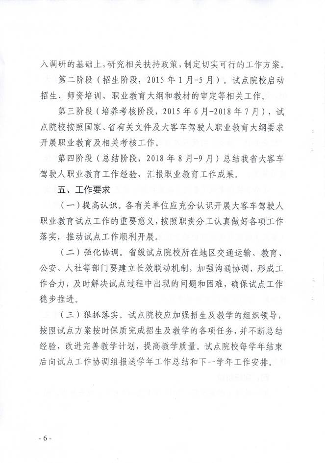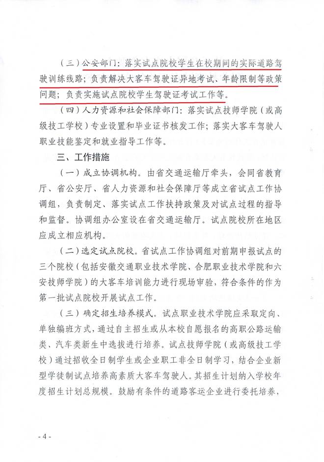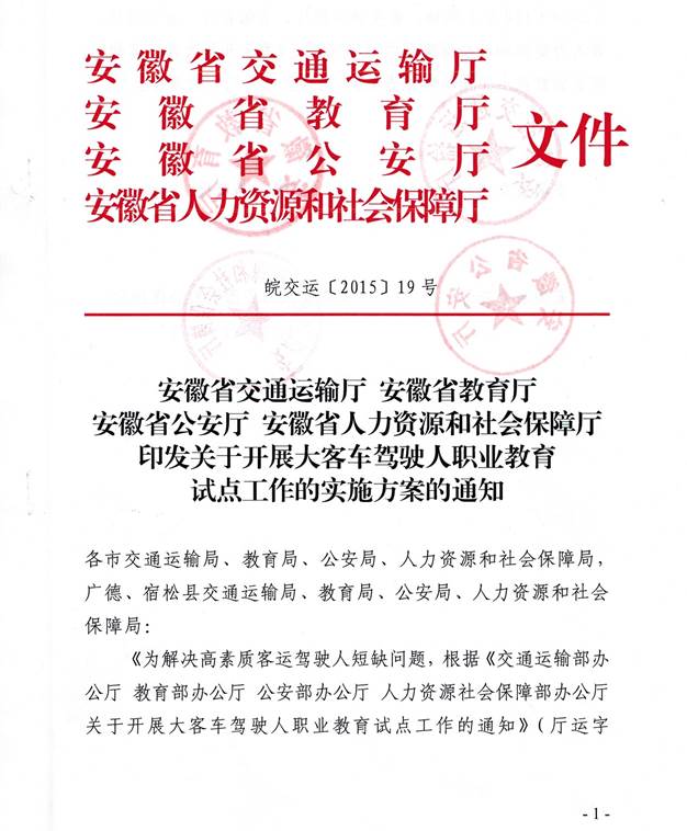 安徽省交通运输厅、安徽省教育厅、安徽省公安厅、安徽省人力资源社会保障厅《关于开展大客车驾驶人职业教育试点工作的实施方案的通知》