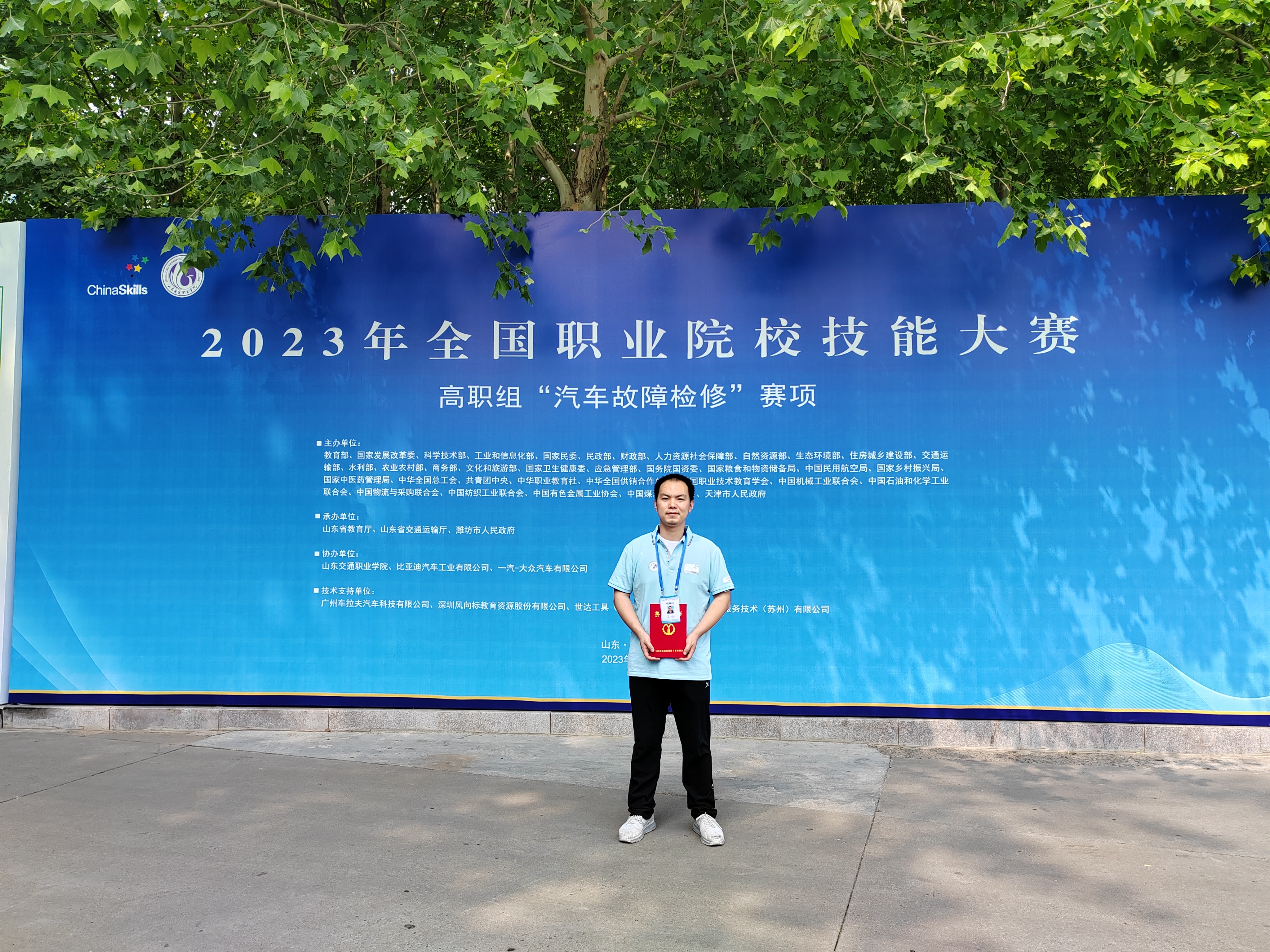 2023年全国职业院校技能大赛高职组“汽车故障检修”赛项在山东交通职业学院举办,汽车故障检修赛项(教师赛)是教育部2023年设置的全新赛项,该赛项聚焦燃油汽车、电动汽车的电控系统故障检修关键核心技术,赛项总时长3小时,分为汽车动力及底盘电控系统故障检修、发动机及车身电控系统故障检修两个模块,在比赛过程中,王岑沉着冷静,凭借扎实的理论知识、过硬的专业技能、良好的心理素质,出色完成了比赛任务,荣获个人三等奖的好成绩。