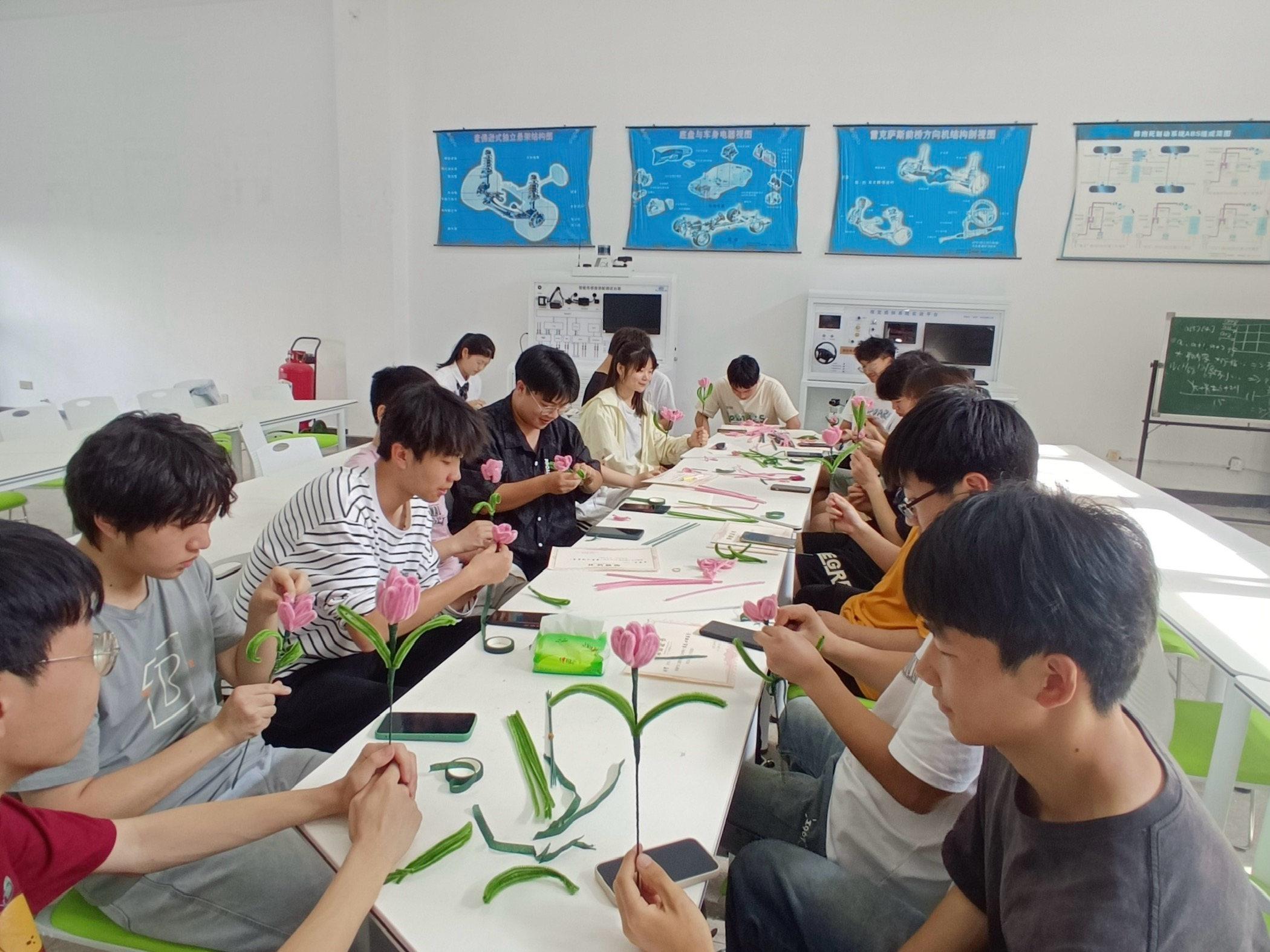 活动开始,指导老师王桂年通过一段生动有趣的视频介绍了扭扭棒的多种使用技巧和创意应用,她将五颜六色的扭扭棒分发给大家,同学们亦可随心挑选其他材料,满足个性化需求。随后,同学们积极参与扭扭棒制作,各自选择喜欢的颜色进行搭配创造,经过弯、扭、拼、绕等一系列操作,一根根不起眼的扭扭棒变成了一束束盛开的花朵。看着亲手制作的作品,大家脸上都洋溢着欢乐的笑容。